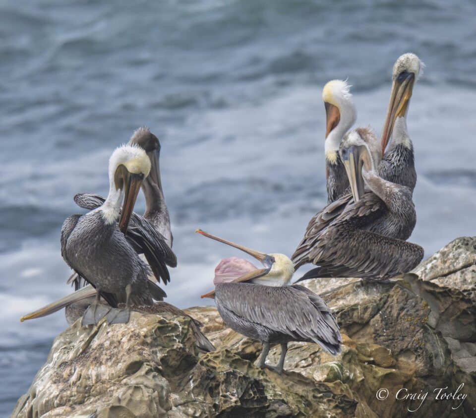 Craig Tooley was at Del Mar beach on Sea Ranch when he found these Brown Pelicans hanging out together on a rock. And another photo where one is in flight.