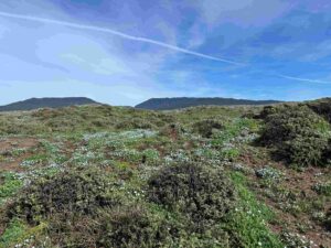 Baby Blue Eyes, Nemophila menziesii, are one of my favorite wildflowers. They grow on sunny bluffs. Seeta Chaganti had her friend, Mary Heibel, take her to Manchester State Park to show her the bloom.
