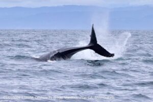 “The captain put the boat in idle (stopped the propeller) to avoid any potential propeller injuries in case we were approached by a curious whale, and we had several curious humpbacks surface near the boat. They don’t have to be very close to know that they have been feeding; their exhales smell strongly like fermented Brussel sprouts! Throughout the day, we photographed many humpback whales breaching, slapping their 15 foot-long front flippers on the water, and thrashing their tails, however, we were only able to get a few views of the underside of the humpbacks’ flukes, the view needed for ID. We had more success with the gray whales and have eight photos of individuals to submit for ID.” Shari and others submit their photos to http://Happywhale.com.