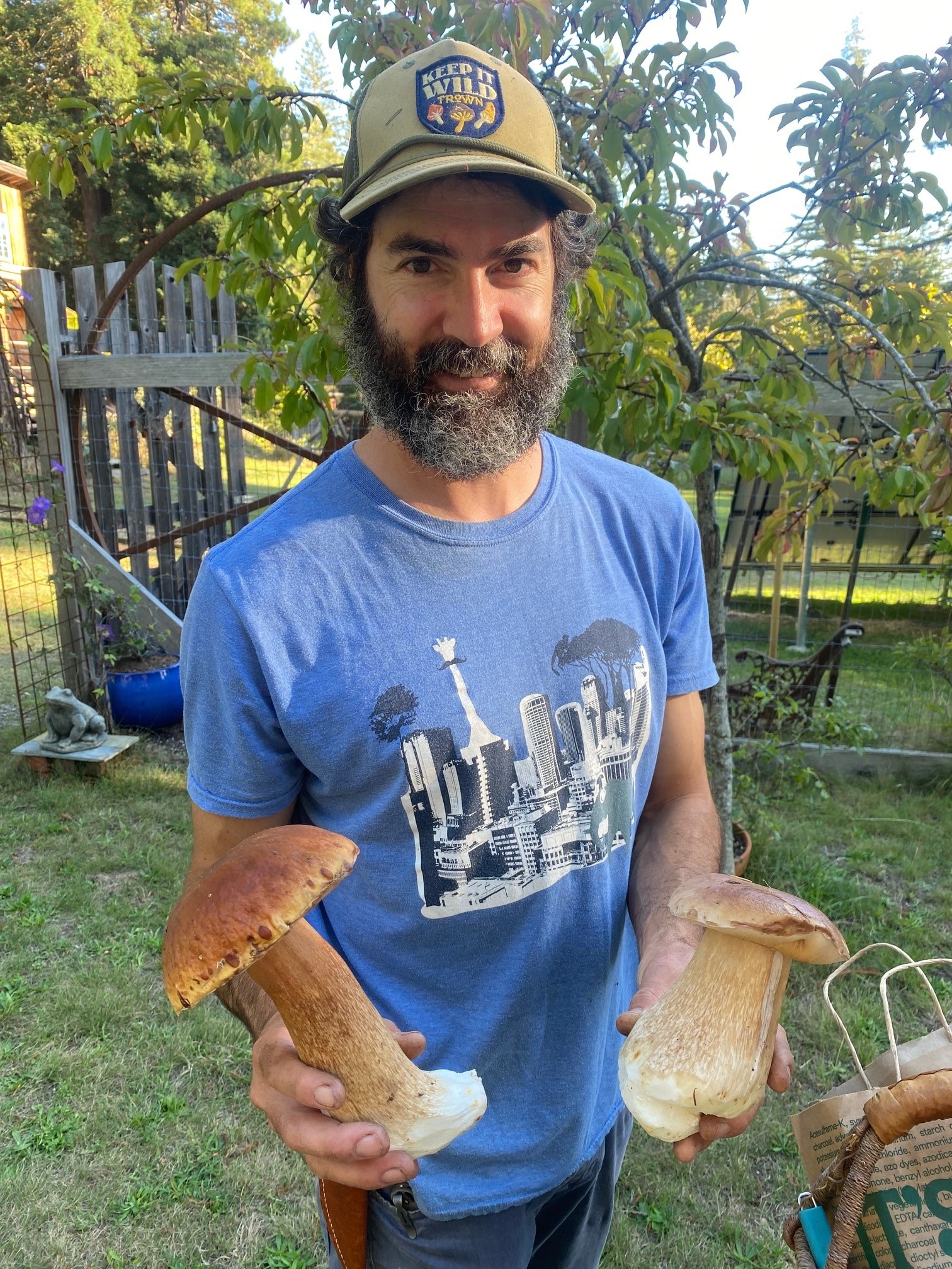We've had enough rain for mushrooms to appear. Boletus edulis, King Boletes, are up, causing many people to have a smile on their faces! A delicious edible, we usually hope to see them in time for Thanksgiving. Early rains are a blessing in more ways than one. Alex Kun was one of the happy foragers. His neighbor Natasha Lynn took this photo.