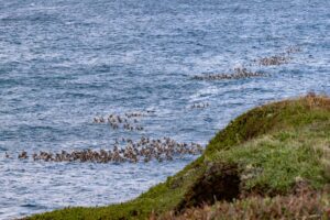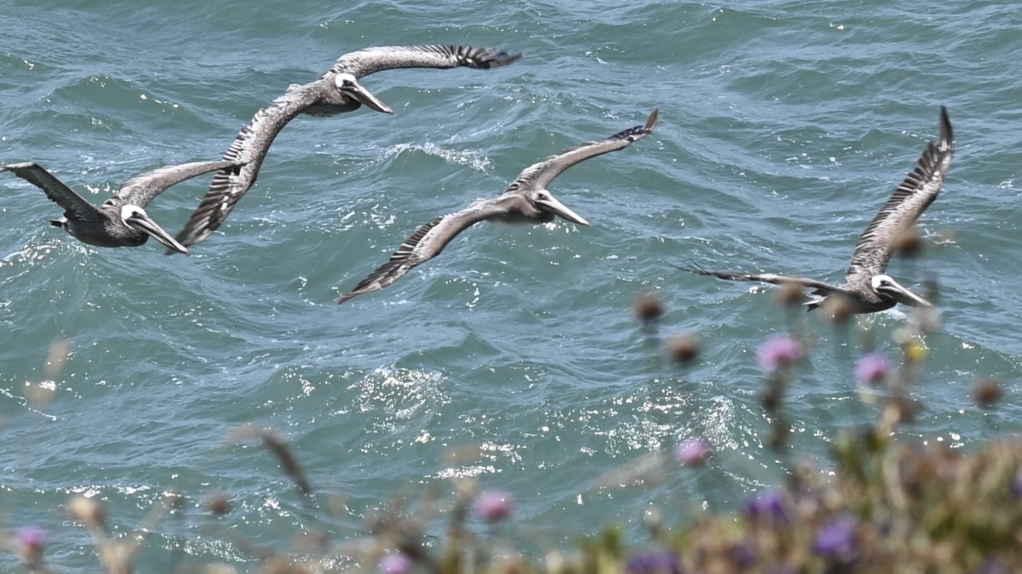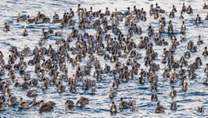 I had never seen this before. Brown Pelicans rest and take shelter on offshore rocks. Jon Shiu noticed hundreds, perhaps a thousand or more, in the water, together in quite a few large groups, very close to the Mendocino Headlands.