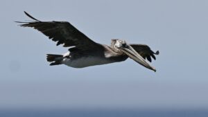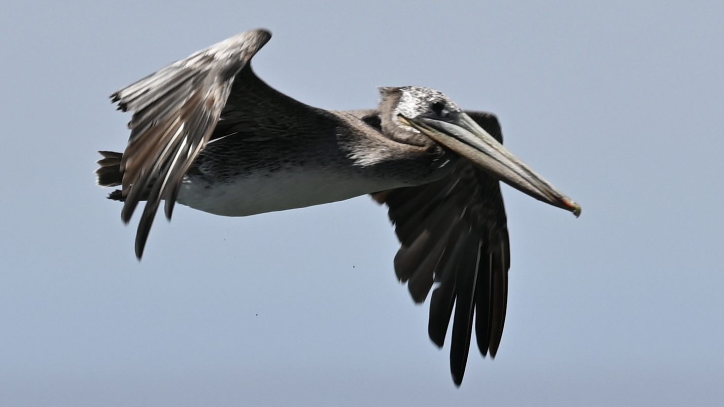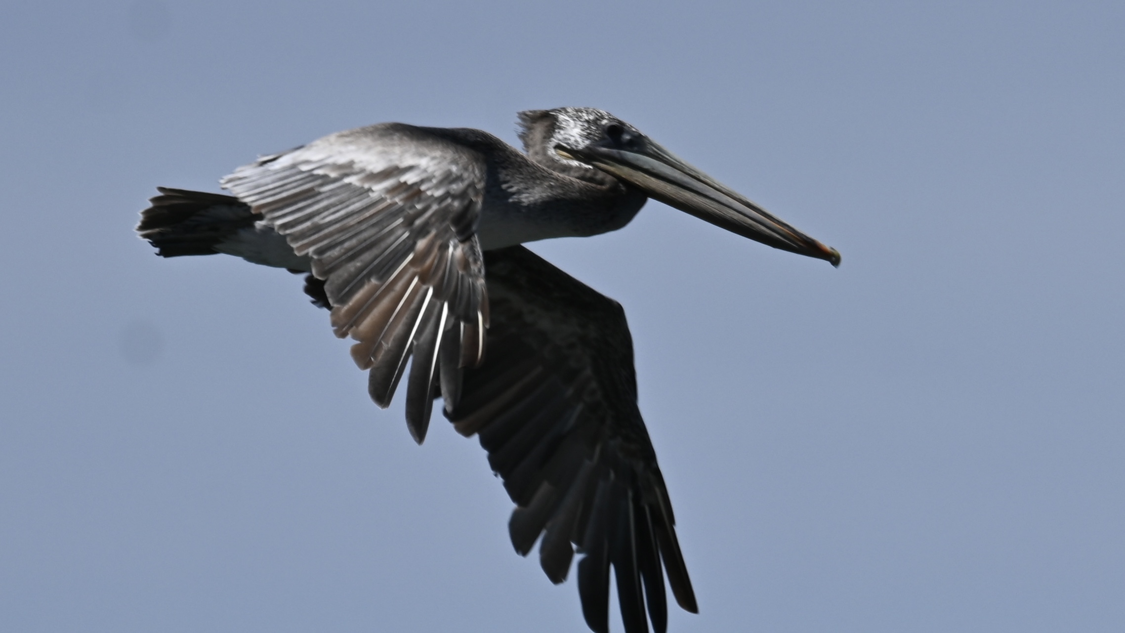 We are seeing Brown Pelicans flying north and south. Near Schooner Gulch, Loch Michie got a photo of a young one that puzzled me. He/she had the white tummy of a juvenile, but the feathers on the head looked to be turning white.